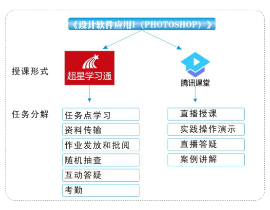 董建义老师通过和其他高校同学咨询和学院老师的讨论,结合《设计软件应用I(PHOTOSHOP)》课程实践性和操作性强的特点,最后博采众家之长,在授课方式上采取了“学习通”+“腾讯课堂”相结合的方式。