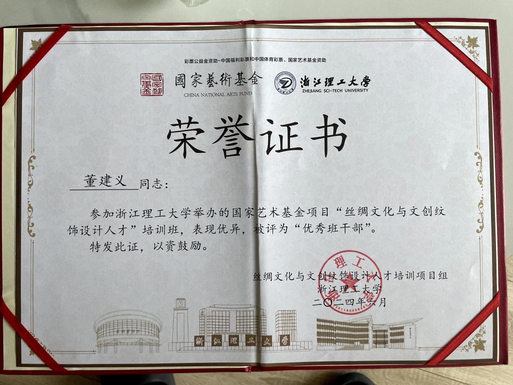 因在培训期间表现优异,在6月26日的项目结业典礼上,公司董建义副教授顺利通过答辩,并被丝绸文化与文创纹饰设计人才培训项目组和浙江理工大学评为“优秀班干部”。