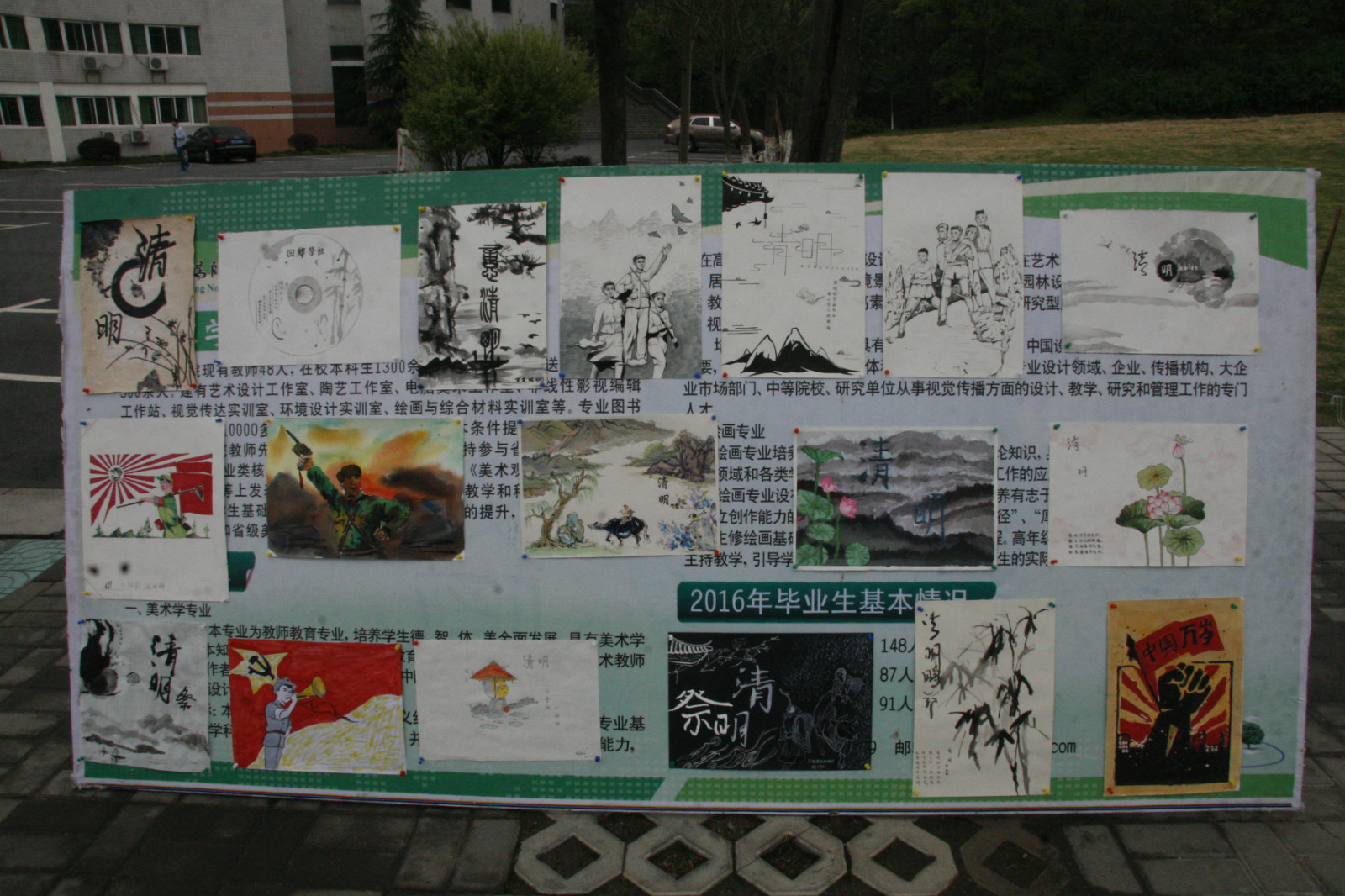 为了让广大学子在传统节日中了解革命先辈的感人事迹,感受革命精神,发扬中华民族奉献他人,奉献社会的优良传统。4月4日,美术学院团总支员工会组织员工以“清明祭——继承优良传统,弘扬奉献精神”为主题举办绘画活动,并在艺术楼前展出同学们的主题作品。