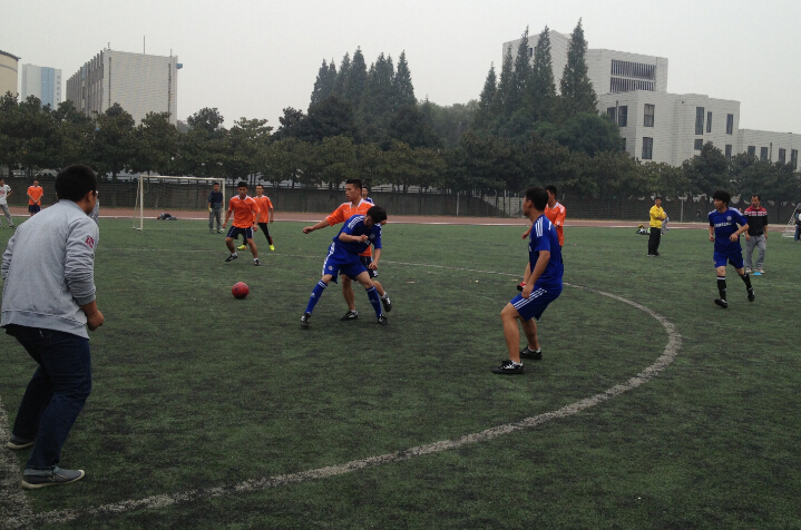 随着一声哨响,比赛正式开始,双方队员展开激烈拼抢,公司凭着激昂的斗志、默契的配合率先踢进一球,引得观众一阵阵欢呼和喝彩。在上半场以1:0领先于体育学院足球队。中场休息时,队员相互加油打气,下半场开始,公司足球队与体育学院足球队展开了持久的拉锯战,使得比赛进入白热化阶段,比赛的最后时刻,由于公司队员的失误,给了对方球员点球得分的机会,最终双方球队以1:1的比分结束了本场比赛。
