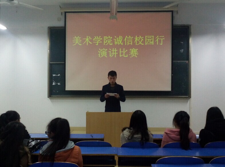 11月22日,由信阳师范学院美术学院团总支员工会举办的“诚信校园行”老员工演讲比赛在艺术楼307教室拉开帷幕。各年级经选拔的三十余名同学参与了此次演讲比赛。
