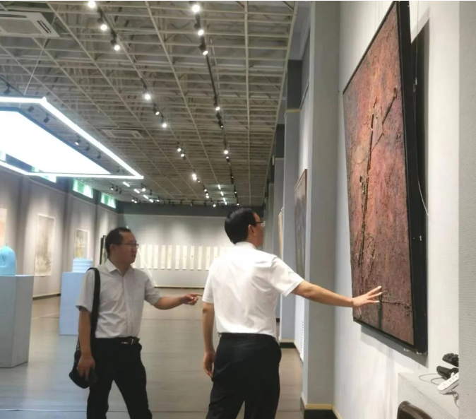 董建义介绍了学院的基本情况,并陪同参观了学院的艺术展厅红色专题展览及研究生工作室、教室等。石品董事长对我院近年来的快速发展取得成绩充分肯定,特别是对我院充分利用信阳红色资源,进行主题美术创作以及在美术届展中取得的优异成绩给予高度赞赏,并就下一步双方在美术设计的人才培养、艺术创作、产学研结合等方面的合作,进行深入交流,希望双方加强联系,优势互补,实现双赢。