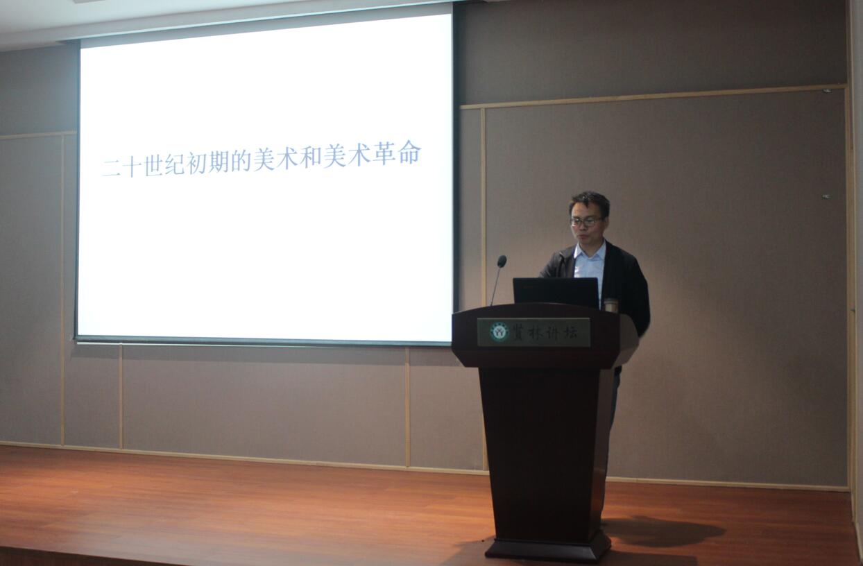 刘永胜围绕“什么是美术”、“为什么要进行美术革命”、“为什么美术革命的方向是写实”、“美术革命的结果是什么”四个方面进行深入分析。刘永胜首先从唐宋“丹青院”、“炫奇会”等名词分析了“美术”一词的来源,并指出“美术”传入我国在早期社会思想里是陶冶性情的,具有目的性和功利性。谈到“美术革命”时,他就“1894年的中日甲午海战”、“知识精英的改变”两方面,结合“洋务运动”、“甲午战争起因和结果”条例清晰地论述了“为什么要进行美术革命”。刘永胜结合二十世纪初知识分子追求“科学”的时代背景,阐述了美术革命向写实发展的原因。他就新青年的思想变化、强调与生俱来的自由精神、新美术思想与传统绘画的区别、美术的工具化、普及化和大众化等方面进行详细讲解,并提出以上方面确立了20世纪中国美术的现代特征的结论。在问答环节,刘永胜面对同学们提出的问题,耐心且风趣地一一解答,并提出切实可行的建议。现场气氛热烈活跃,讲学活动在雷动的掌声中圆满结束。