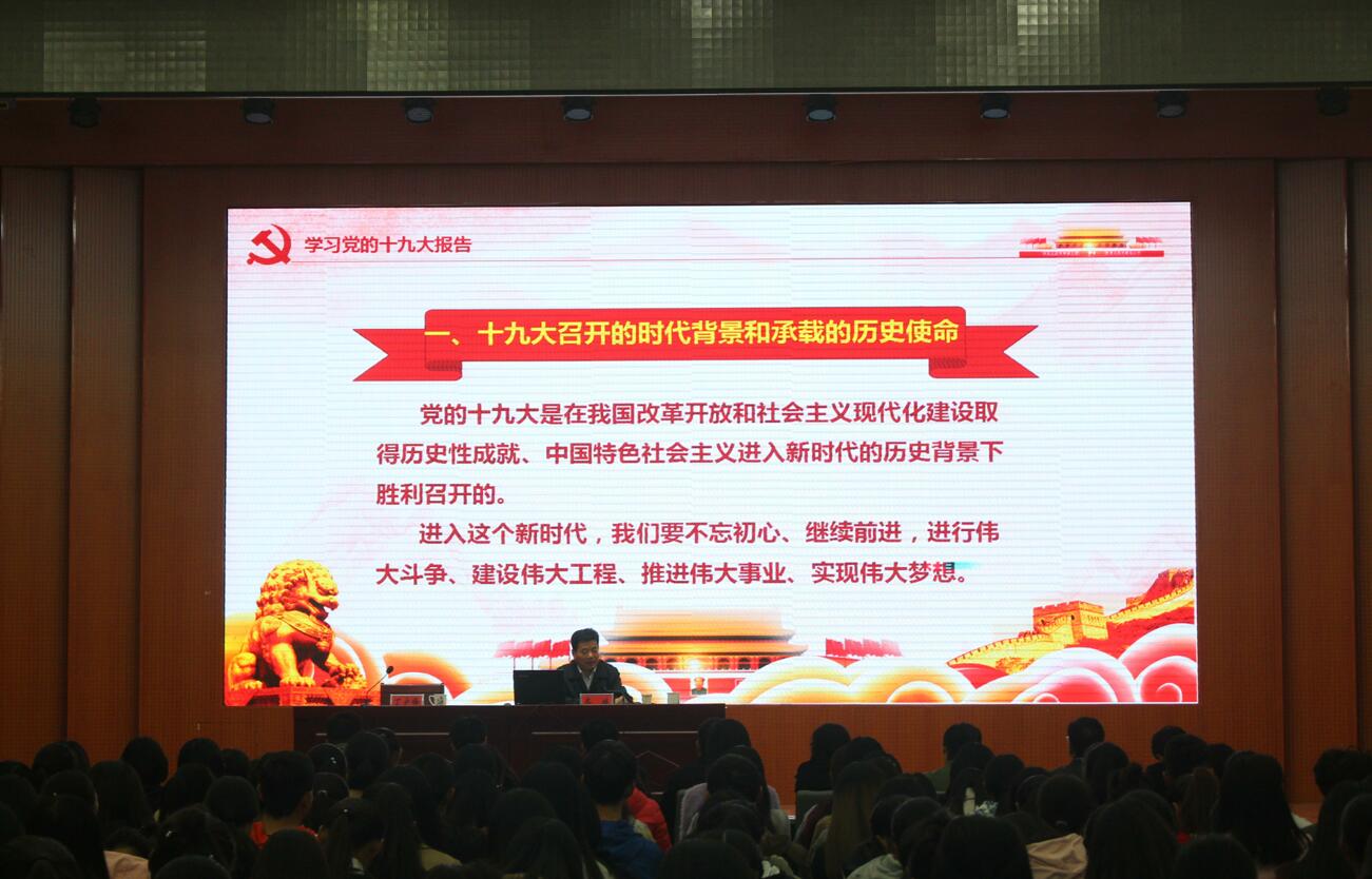 本次专题报告会的开展,旨在确保将党的十九大精神的学习贯彻深入到每名师生中,提高其思想觉悟和政治责任感,鼓励其在实现中国梦的实践中放飞青春梦想,在为人民利益的不懈奋斗中书写人生华章。