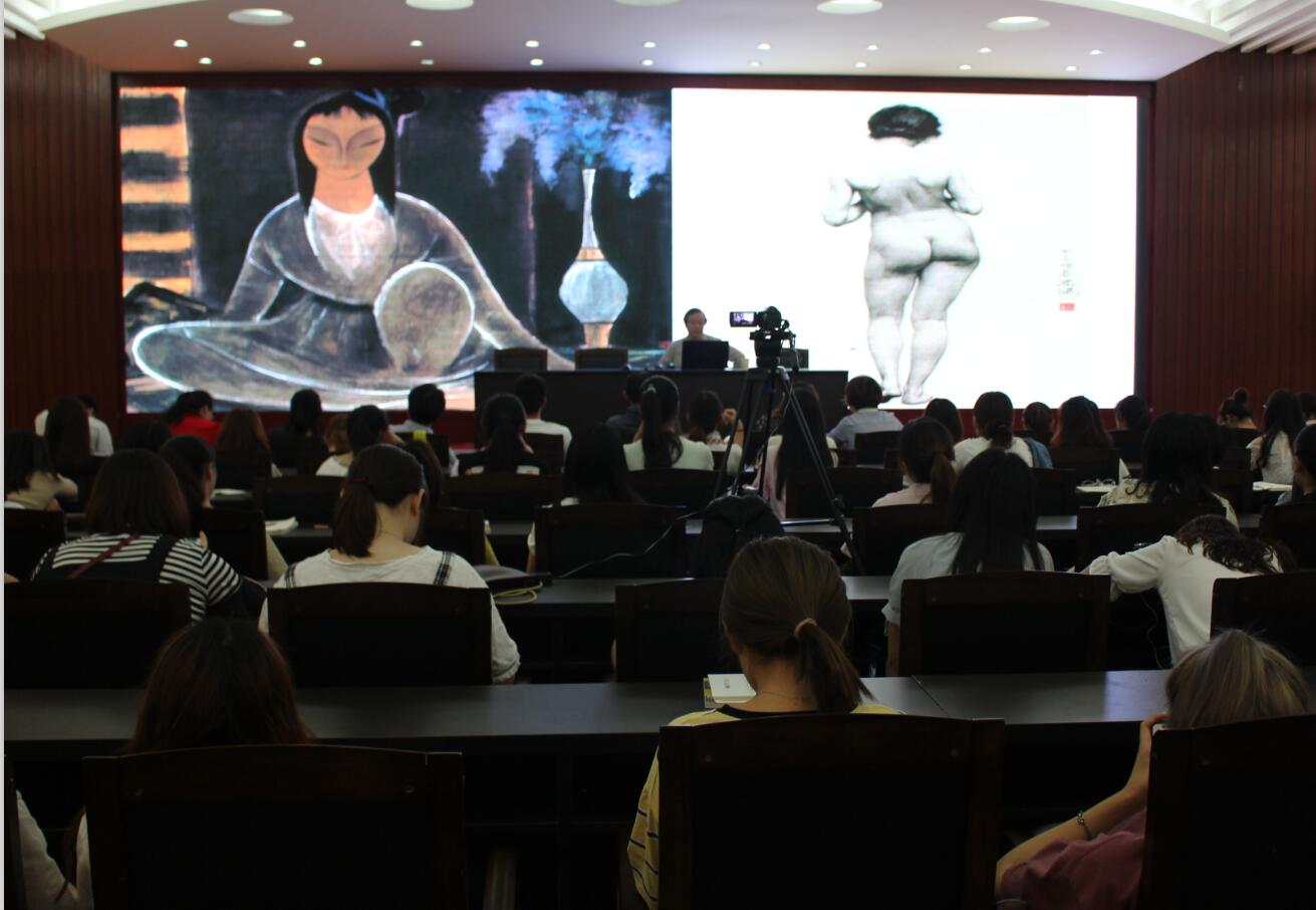 韩学中教授围绕“变革中的中国人物画作”展开叙述。他将自身经历及多年的研究资料相结合,以故事的形式讲述每幅画作的意义及艺术价值。期间,他以壁画为例指出了中国画的风格与主题,他强调特定时空中特定人物的个性精神表现,在共性之中求个性。创作时必须以极高的热情投入到画作中,创作出具有“生活体验、心灵净化、生命洞达、哲理思辨”的作品。同时他鼓励同学们多看多练,不断提高个人的艺术修养。在学术互动交流环节,公司师生积极发言提问,现场座无虚席,反响热烈,师生们受益匪浅。