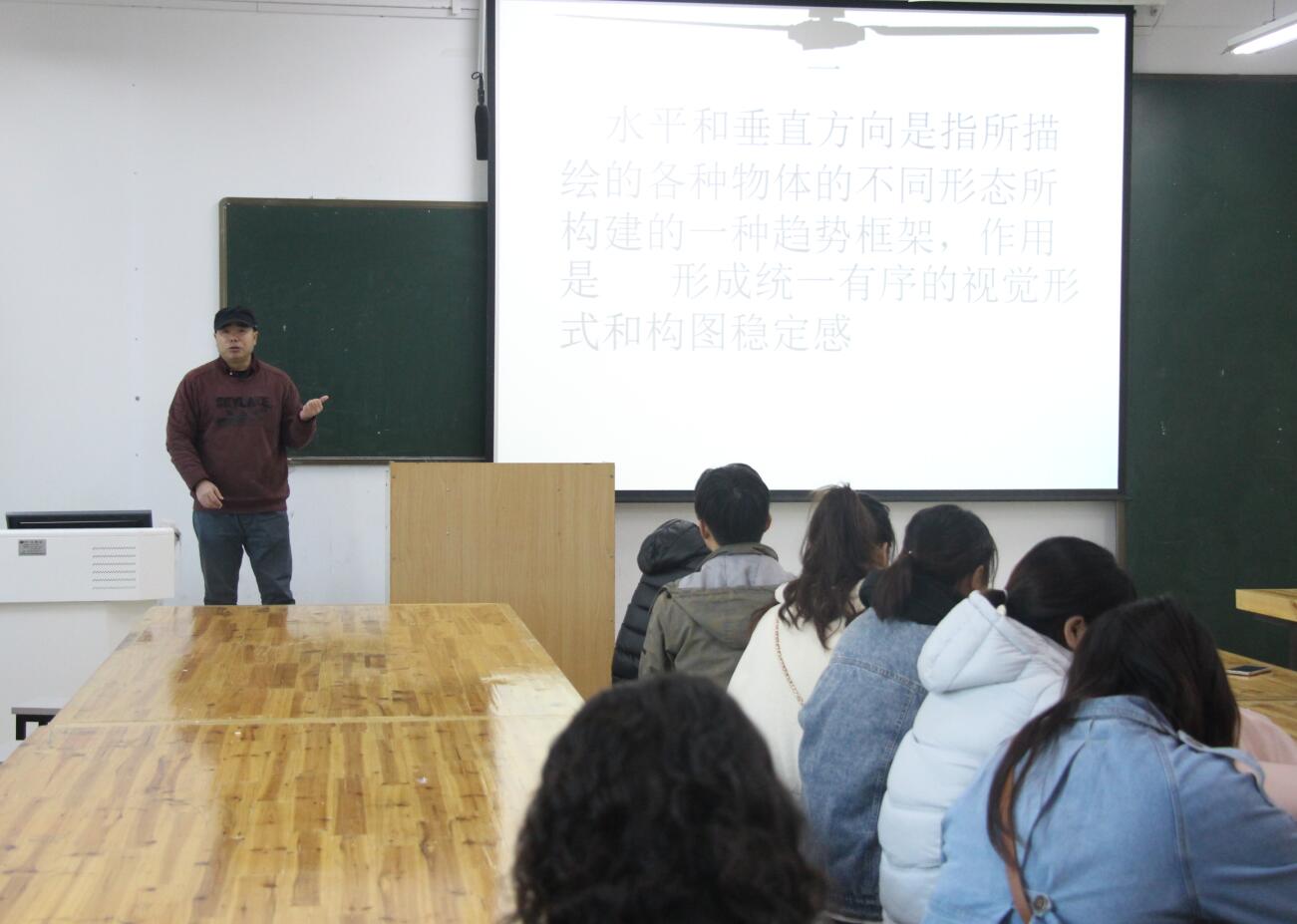 首先,张卫平进行题为“风景画中的水平和垂直要素”的示范教学,他以“水平”和“垂直”两个要素为切入点,并通过精心准备的课件对此展开了全面的理论讲解。张卫平向大家鉴赏分析古时的篆刻印章和山水画作品,指出水平和垂直方向是指所描绘的各种物体的不同形态所构建的一种趋势框架。随后他又分析了古今中外的风景作品,充分讲解水平和垂直对风景画创作的重要性。课上张卫平以自己的教学经验将老师和员工们带入风景创作艺术的世界,给人以美的享受。最后,涂湘东就此次示范教学发表了自己的见解并提出建议。