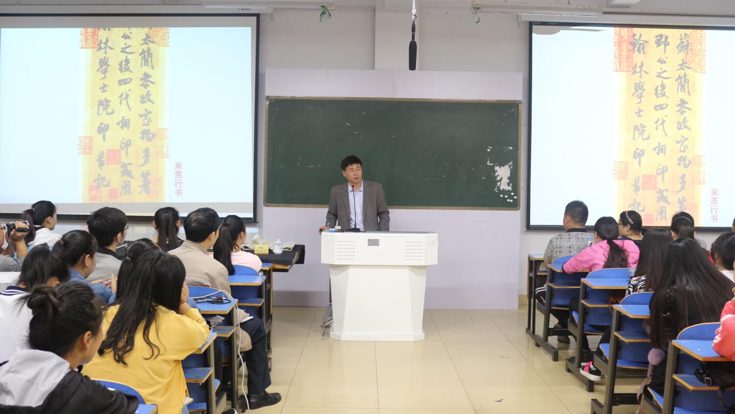4月26日下午,著名书法家、中国书法家协会理事、河南省书法院经理、河南书协副主席李强举办“书法与茶的对话”学术讲座,并与师生进行了互动和书法创作示范。