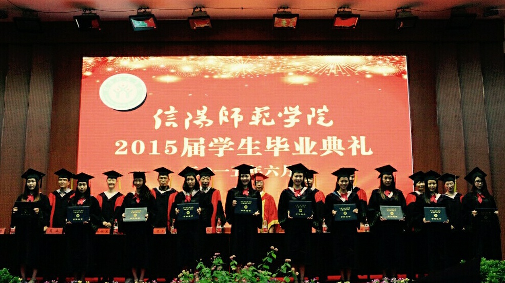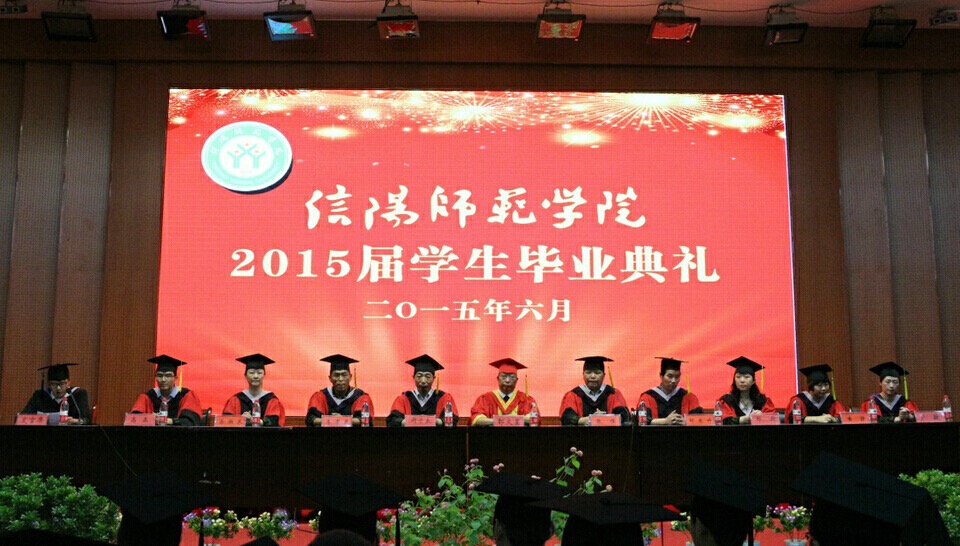 毕业典礼开始前播放老师和同学们的寄语视频,每个人都在衷心的祝愿着,感动了在场的所有人。副经理张伟宣布典礼正式开始。美术学院学位委员会副主任委员邹东升副经理宣读信阳师范学院关于授予2015届毕业生学士学位的决定。