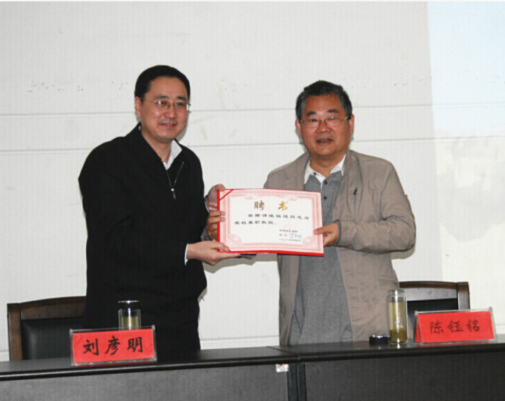 首先,美术学院经理刘根货对陈钰铭先生的基本情况作了简要介绍,信阳师范学院副董事长刘彦明对画家陈钰铭的到来表示热烈欢迎,并向陈钰铭先生颁发兼职教授聘任书。