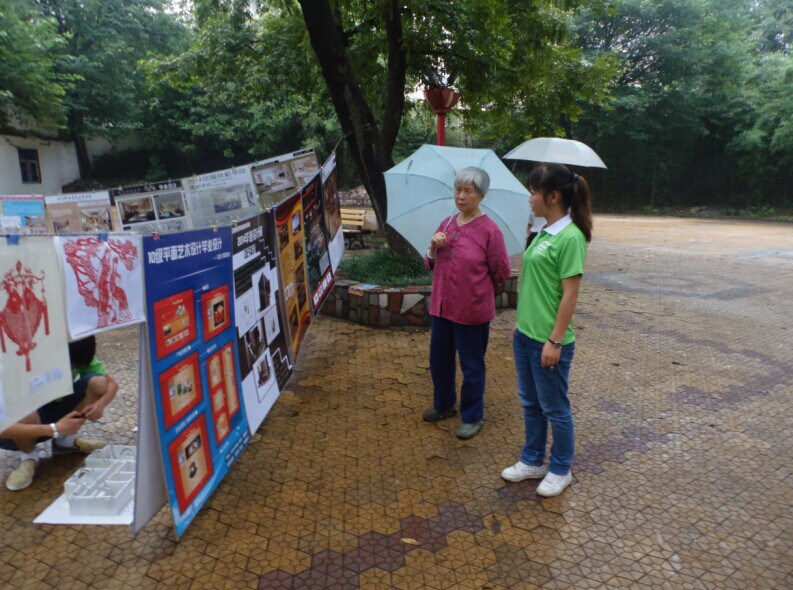 本次展览依托公司参加河南省第十四届科技文化艺术节中绘画、摄影、篆刻、书法、设计等优秀作品,结合公司2014年毕业生优秀毕业作品,实践小组成员充分利用各种资源,在浉河公园进行展览、讲解,并进行现场绘画、书法等活动,现场群众踊跃参观,现场观众络绎不绝,气氛热烈。之后进行的字画赠送活动使小组成员与群众充分互动,公司员工现场作画、写字,赠与围观群众。雅致的山川水墨画,遒劲的行书楷书,得到现场观众的一致好评和热烈掌声。