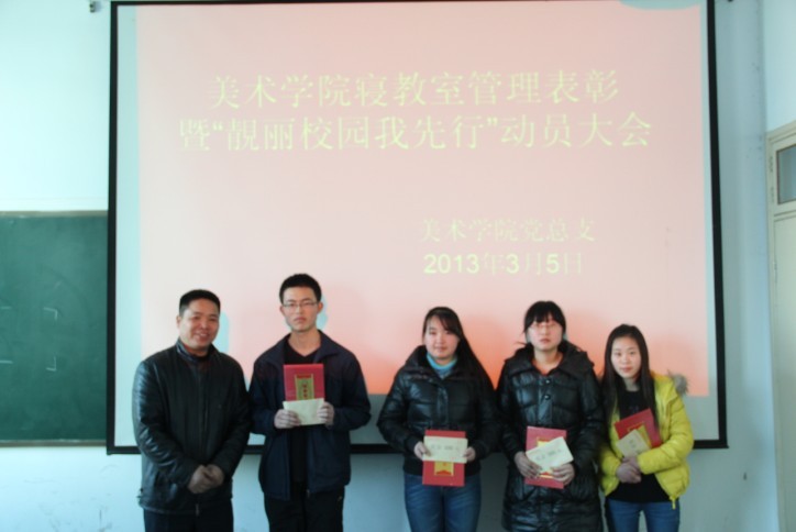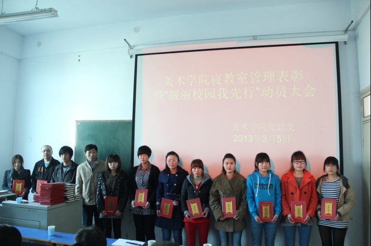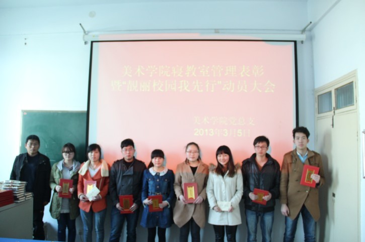大会在热烈的掌声中开幕。美术公司党总支副书记李孝民首先宣读“信阳师范学院寝教室管理工作先进集体及个人”名单,公司党总支书记周子良依次为2012年寝教室管理先进班集体、寝教室管理文明教室班级代表、寝教室管理先进个人、文明寝室代表、优秀寝室长颁发了荣誉证书和奖品。接着,周子良书记宣读“信阳师范学院文化进公寓获奖作品作者”名单,副经理张伟为文化进公寓获奖作品作者颁发荣誉证书和奖金。