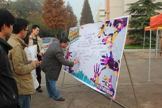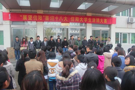 11月10日,由信阳师范学院团委、信阳师范学院美术学院、信阳农业高等专科学校团委、信阳职业技术学院团委主办,信阳师范学院老员工美术爱好者协会承办的2012“展望信阳”喜迎十八大信阳老员工涂鸦大赛总决赛在信阳师范学院艺术楼前隆重举行。信阳师范学院、信阳农业高等专科学校、信阳职业技术学院、信阳师范学院华锐学院四所高校的团委负责老师及社团指导教师应邀参加了此次大赛的开幕式和作品评审,来自上述四所高校的200余名选手入围参加了此次总决赛。