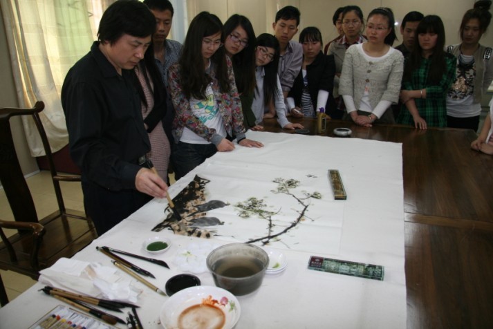 报告中,曹桂生教授从“中国画艺术概说”、“中国画的审美取向”、“中国画的意象特征”等三个方面作了系统讲解。曹桂生教授声情并茂的演讲、丰富翔实的图文资料,不时赢得在场听众的阵阵掌声。随后,他就国画创作技巧、方法等问题和现场师生进行了交流。最后,曹教授在美术学院临摹室,向同学们讲述自己在创作中的一些体会,并现场挥毫,为同学们示范绘画技巧。