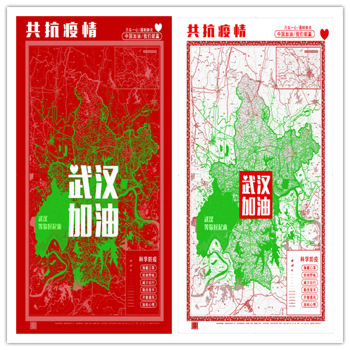 当时看到新闻时得知武汉封城,便用百度地图查看武汉的区域。发现因为交通禁行所有道路变成了红色,整个武汉就是一个红色色块,这深深震撼了我。所以就用地图来创作,在海报里将颜色翻转,希望武汉可以尽快恢复绿色的正常交通状态,待交通恢复,武汉的疫情便已结束了。