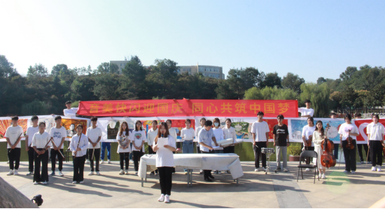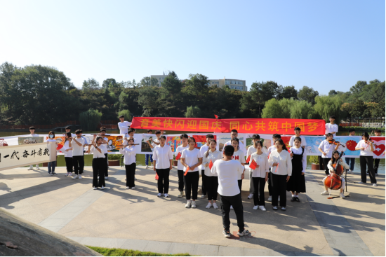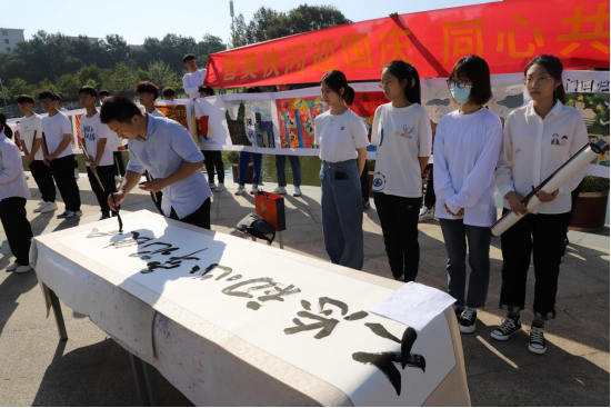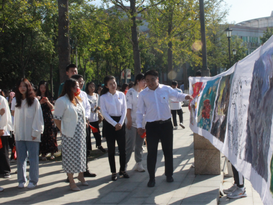 书法教师张峰蘸墨挥毫,借笔传情,以酣畅淋漓的动作创作了四副书法作品,体现了当代青年“强国一代 奋斗有我”的担当。音乐与舞蹈学院带来的歌曲《唱支山歌给党听》抒发了当代老员工的爱国情、报国志。最后,全体合唱《我和我的祖国》将本次活动推向高潮。活动吸引了大批行人纷纷立足观看,拍照留念,现场一片火热。