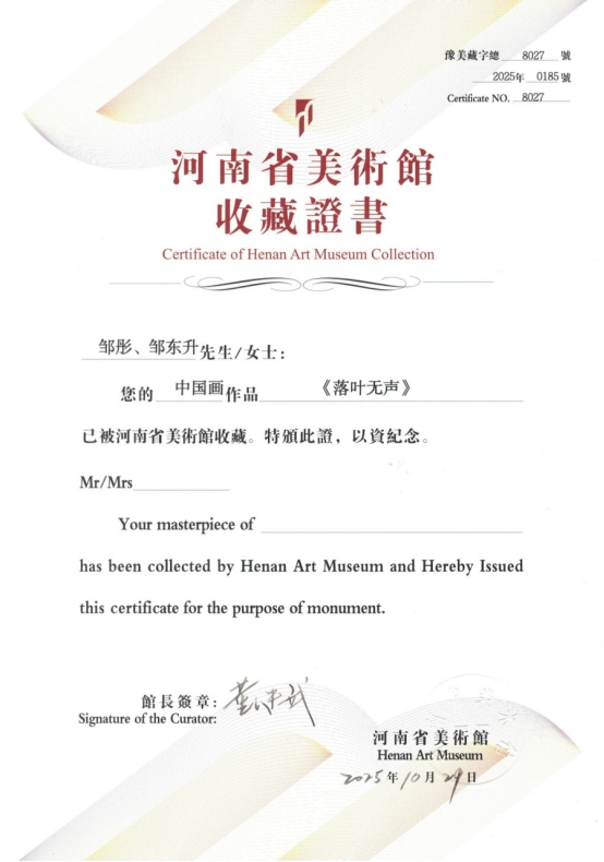 近日,在“纪念中国人民抗日战争胜利暨世界反法西斯战争胜利80周年——河南省美术书法摄影作品展览”中,云顶yd2223线路检测经理、市美协主席邹东升与青年教师邹彤合作创作的中国画作品《落叶无声》,凭借其鲜明的红色主题与精深的艺术功力,被河南省美术馆正式收藏。