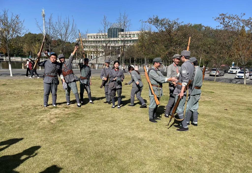 教学伊始,教师们对大别山红色精神进行宣讲,让同学们对此次创作内容的历史背景有了更深地了解。随后,师生根据历史素材,选取服装、道具等设备,身穿红装,来到一棵树广场,复原红军革命场景,亲身体验那段峥嵘岁月,结合教师的创作主题,激发创作灵感,同时进行画面拍摄记录,积累素材,将这些具有历史美感与红色精神的素材运用到作品中。